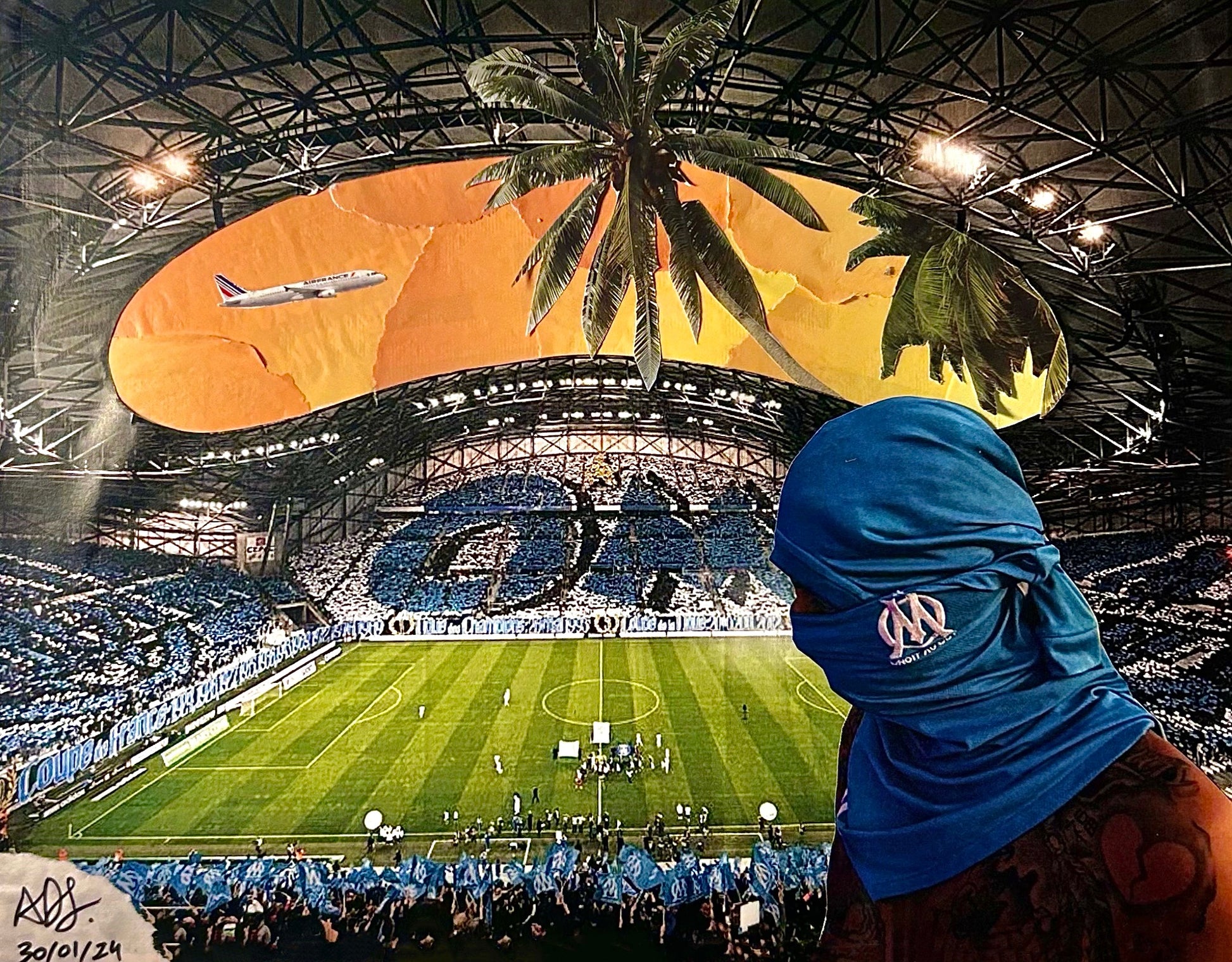 Collage imprimé sous forme de poster, issu de la création faite à la main "Jour de match". Format proche de celui sélectionné (faibles variations selon les imprimeurs).